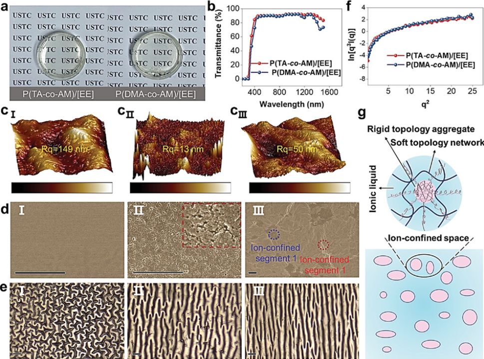 该工作报道了一种通过改变聚合物凝聚态结构以形成柔性-刚性二元限域空间来调节离子凝胶分子构象的策略:第一种聚合物在离子液体(ILs)的强约束下表现出柔性网络拓扑结构,而第二种聚合物由于与ILs的弱相互作用而表现出刚性网络拓扑结构。