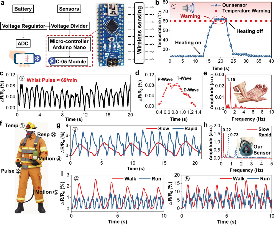 1. 最后,该工作设计了一个可穿戴的多模态监测系统,可用于检测温度、手腕脉冲和运动信号。由于其稳定的机械和热学性能,其不仅可以监测消防员的生理温度信号,还能安装在消防头盔的表面上。当外部热源靠近传感器时,智能手机应用程序可以在消防头盔表面准确显示实时温度数据,并在检测到危险温度时激活安全警报。