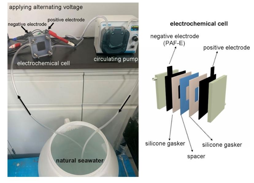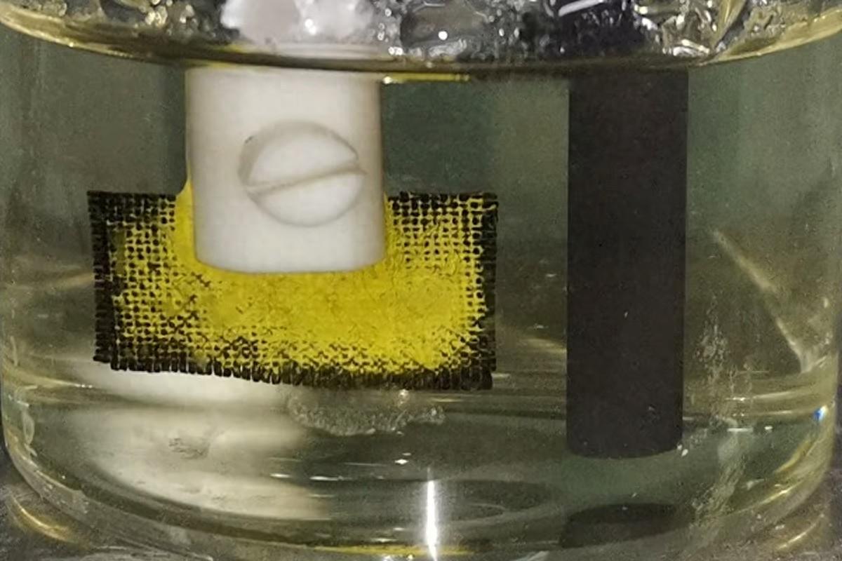 当把这种布放入海水中,并加上石墨阳极通上电后,在交变电场的作用下,铀酰离子会被选择性地捕获,随后通过可逆电子转移生成铀酸钠氧化物{Na2O(UO3·H2O)x}沉淀下来。简单来说,这个过程就是通过电化学反应,先吸附铀酰离子,然后通过电子转移将其还原和氧化,最后形成可以收集的亮黄色沉淀物。