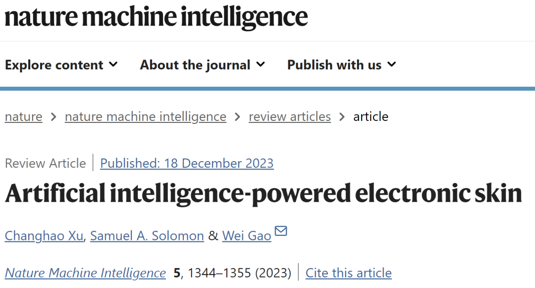 2023年12月18日,加州理工学院医学工程系高伟教授课题组在Nature Machine Intelligence(IF=24)杂志在线发表题为 “Artificial Intelligence-Powered Electronic Skin” 的综述文章,深入分析了人工智能在材料设计、数据处理、人机交互和健康监测中的关键应用,同时指出了当前面临的挑战和未来研究的方向。