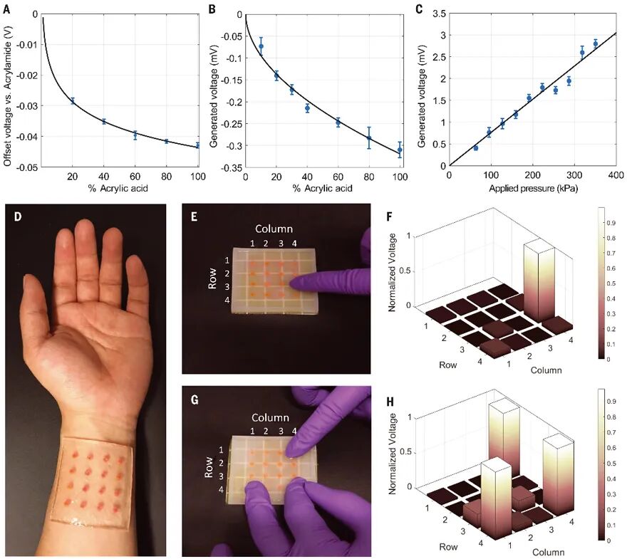 压电离子传感技术为进一步探索与神经系统相互作用的离子皮肤提供了可能。已知生物体内,钠钾泵维持静息跨膜电位约为-70 mV,通过调节丙烯酸(AA)和丙烯酰胺(AAm)共聚物的比例,可将“静息电位”提高至-50 mV。研究者制备了4×4的传感器阵列并进行测试,手指轻按(约100克的力)可产生约-10 mV的电压改变,且几乎没有串扰现象。