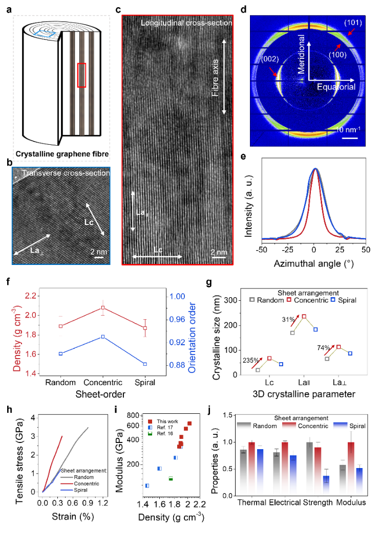 图3. 理想石墨烯纤维的高度有序结构、致密度、结晶性能。