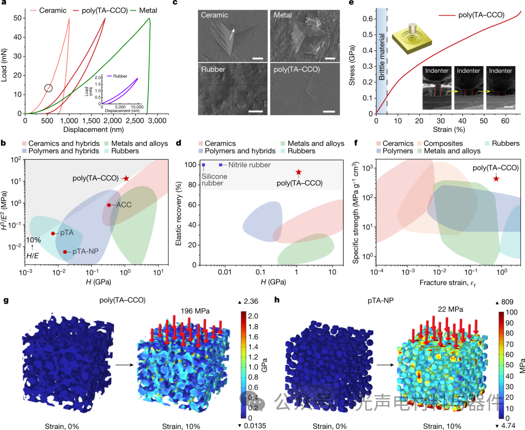 a, 聚(TA-CCO)块体、典型陶瓷(方解石)、金属(铝)和橡胶(硅橡胶)的代表性载荷-位移曲线。b, 将聚(TA-CCO)块体、无定形CaCO₃ (ACC)、pTA、pTA-NP与其他典型工程材料(包括陶瓷和基于陶瓷的复合材料、金属及合金、橡胶、聚合物及基于聚合物的复合材料)的H3/E2与H值进行比较。灰色区域代表H/E ≥ 10%的区域。c, 压痕测试后残留印痕的原位SEM图像。白色箭头指示出现裂纹。标尺条,2微米(陶瓷和橡胶),5微米(金属),4微米(聚(TA-CCO))。d, 聚(TA-CCO)的弹性恢复率和硬度(H)与典型陶瓷、金属及合金、橡胶、聚合物及基于聚合物的复合材料相比较。灰色区域代表普通橡胶≥75%的弹性恢复区域。e, 聚(TA-CCO)微柱压缩过程中获得的应力-应变曲线。插图,原位压缩测试的SEM图像。标尺条,2微米。f, 聚(TA-CCO)的比强度和断裂应变(ɛf)与陶瓷、金属及合金、橡胶、聚合物及有机-无机复合材料相比较。g, h, 聚(TA-CCO)中共价-离子双连续网络(g)和pTA-NP中有机-无机纳米复合材料(h)在0%和10%应变下的计算冯·米塞斯应力分布。在10%应变时,聚(TA-CCO)的平均垂直应力为196 MPa,pTA-NP为22 MPa。为了使无机网络/粒子中的应力分布更清晰,有机部分被隐藏
