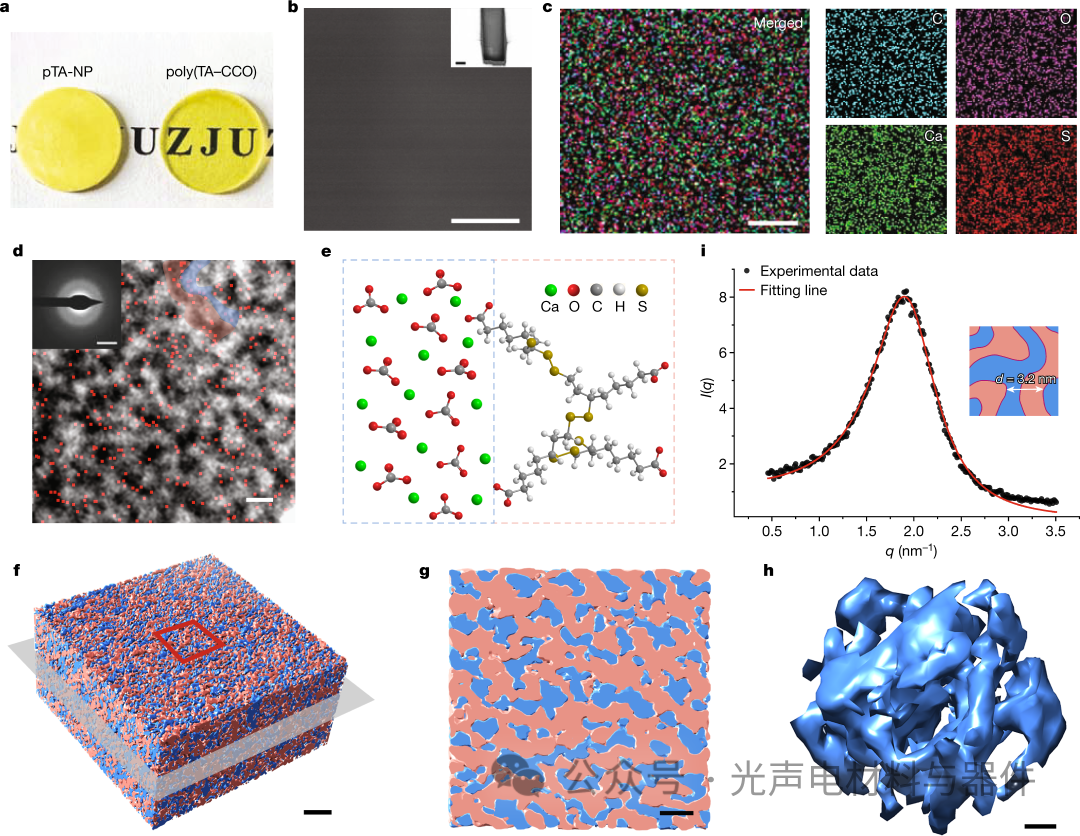 a, 透明聚(TA-CCO)块体和非透明TA-CaCO3纳米复合材料(pTA-NP)的光学照片。它们的直径为10毫米。b, FIB-SEM图像显示了聚(TA-CCO)块体的横截面视图。插图显示了FIB刻蚀的矩形槽。标尺条,150纳米(主图),5微米(插图)。c, C、O、Ca和S的元素映射及其合并图像。标尺条,100纳米。d, 聚(TA-CCO)块体的HAADF-STEM显微照片。红点对应于元素映射中的元素S。蓝色和红色区域分别表示CaCO₃和TA的存在。插图显示了d中所选区域的电子衍射图案,表明聚(TA-CCO)的无定形特性。标尺条,5纳米(主图),3纳米−1(插图)。e, d中蓝色和红色区域的分子结构的示意图。f, 聚(TA-CCO)块体的3D冷冻电子断层扫描重构图。蓝色和红色区域分别代表CaCO₃和TA。标尺条,5纳米。g, f中红色方框区域的放大横截面图像。标尺条,5纳米。h, f中部分CaCO₃网络。i, 聚(TA-CCO)块体的1D SAXS轮廓图,该图通过Teubner-Strey模型进行拟合。拟合的结构周期为3.2纳米,与插图中所示TA-CCO杂化分子的大小一致