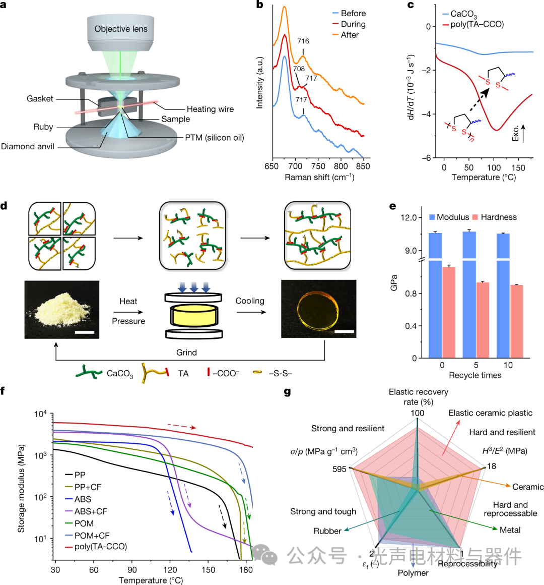 a, 用于研究温度-压力处理下结构变化的原位拉曼装置示意图。b, 在温度-压力处理前、中、后,聚(TA-CCO)的原位拉曼光谱,显示CO3²⁻-Ca²⁺的可逆结合。压力设定为110 MPa,温度从25°C升至120°C,然后降至25°C。c, CaCO₃和聚(TA-CCO)的DSC热图谱,显示在热处理过程中S-S结合的可逆性。d, 聚(TA-CCO)在热和压力处理下的可塑性重塑的可逆结构演变的示意图和相应的快照。标尺条,5毫米。e, 原始聚(TA-CCO)块体及经过五次和十次循环后的硬度和杨氏模量。误差条表示标准差,n ≥ 5。f, 聚(TA-CCO)的储存模量与广泛使用的商品塑料(PP,PP+CF,ABS,ABS+CF)和工程塑料(POM,POM+CF)的比较。g, 弹性陶瓷塑料(聚(TA-CCO))和典型橡胶(硅橡胶)、陶瓷(ZrO₂)、金属(铝)和聚合物(PP)的机械性能,以雷达图形式绘制了弹性恢复、H³/E²、比强度(σ/ρ)、应变(εf)和可重塑性