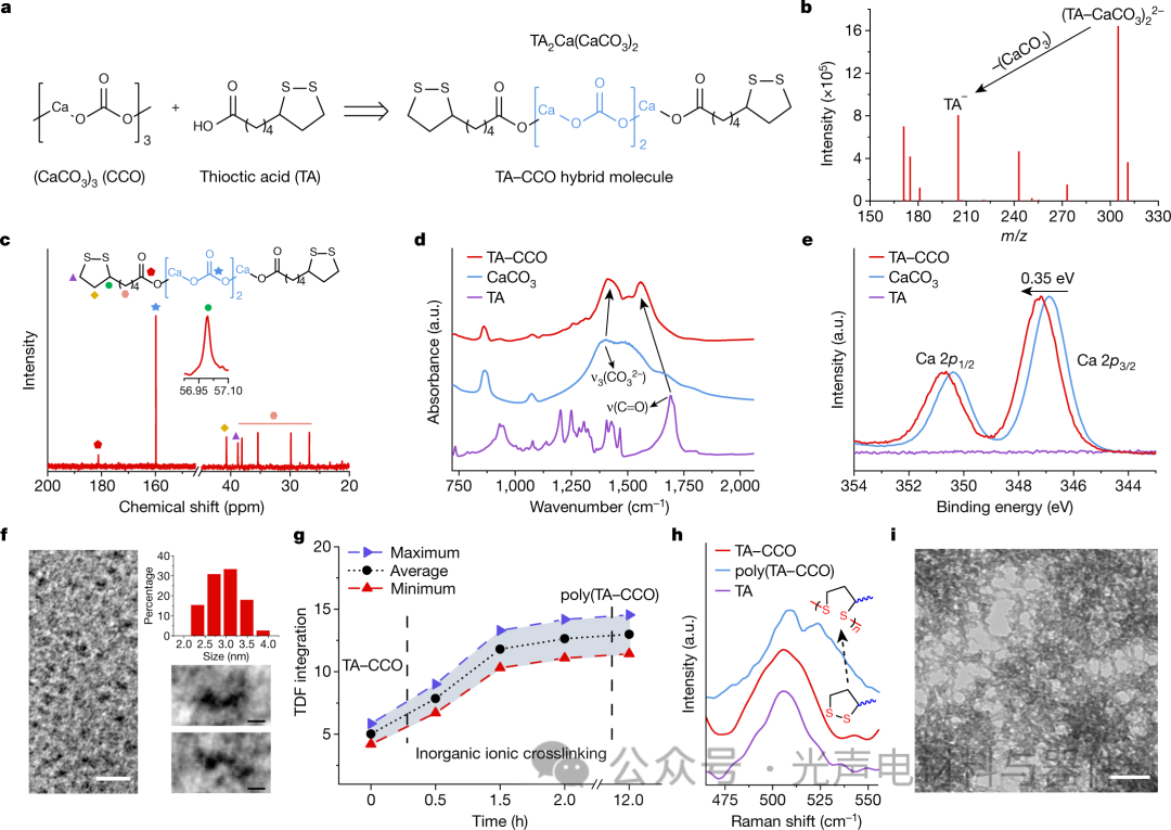 a, 构建TA-CCO杂化分子的方案。b, TA-CCO杂化分子的质谱图;主要峰值用相应的分子片段标记。c, TA-CCO杂化分子在乙醇中的液态13C核磁共振(NMR)谱图。相关的碳原子用分子结构和化学位移标记。d, TA-CCO、无定形CaCO3和TA的红外光谱(FTIR)图。箭头显示相应峰值的移动。e, TA-CCO、无定形CaCO₃和TA中Ca 2p的X射线光电子能谱(XPS)图。f, 左侧,TA-CCO杂化分子的高分辨透射电子显微镜(HRTEM)图像。右侧,TA-CCO杂化分子的尺寸分布(上方)和高放大图像(下方)。标尺条,10 nm(左侧),1 nm(右下方)。g, 在大约2.4埃(指Ca-O配位)处峰值的TDF整合的变化,显示了TA-CCO杂化分子中无机段的无机离子交联(在Ca和O之间形成更多的结合)。最大值和最小值是由于交联过程中乙醇和TA-CCO之间的数密度变化而产生的。h, TA-CCO、TA和聚(TA-CCO)的拉曼光谱图。506 cm−1处的峰值分裂为两个峰,验证了通过开环聚合反应的分子间S-S结合。i, 用TEM图像描绘TA-CCO杂化分子的交联(由无机段实现)和聚合(通过有机段上的S-S键)
