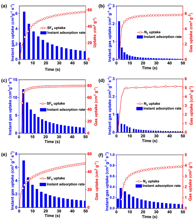 2)某些吸附仪(从文章报道里知道国产的贝士德吸附仪是有这个功能,见下图,图片来自Angew. Chem. Int. Ed. 2022, 61, e202207066,通讯作者:西安交大杨庆远教授)具有测试吸附动力学相关的功能,暂时叫伪动力学吸附曲线吧。测试机理是这样的:定量的往吸附管里投入一定量的气体(这个气体量要满足样品在吸附饱和后仍有剩余),仪器时时(比如每隔1s)监控吸附管里的气体压强,转化成气体体积,就能得到每隔一定时间气体被吸附的量,从而得到一个伪动力学吸附曲线。为什么叫它伪动力学吸附曲线?因为随着气体被吸附,吸附管里的气压逐渐降低,因此每个点的数据是在不同的吸附压力下测得。而我们平时讲的吸附动力学数据往往应该是定压的。测试这个数据的时候,要考虑吸附管的死体积,投入得气体量要远远高于样品吸附量才行。投入气体量不同,得到的数据差异很很大,所以不同组之间重复性较差,只能定性看看。