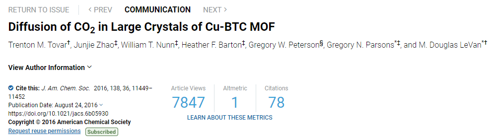 52. T. M. Tovar, J. Zhao, W. T. Nunn, H. F. Barton, G. W. Peterson, G. N. Parsons, M. D. LeVan, Diffusion of CO2 in large crystals of Cu-BTC MOF. J. Am. Chem. Soc. 138, 11449–11452 (2016). doi:10.1021/jacs.6b05930 Medline