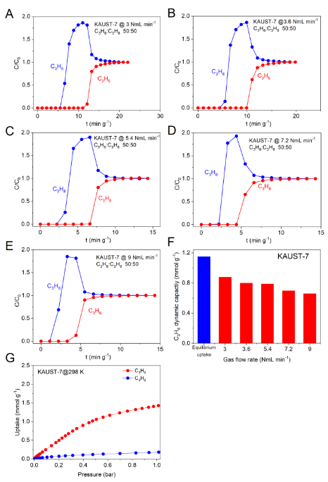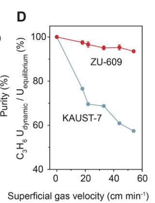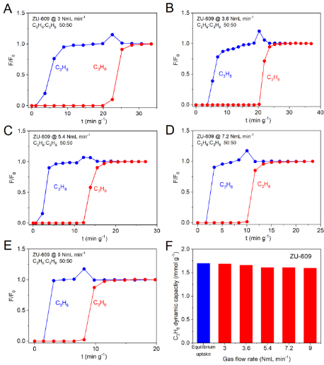 在吸附分离领域,常见的分离机理有热力学分离、动力学分离、分子筛分(可以认为是动力学分离的极限状态)、热力学-动力学协同分离等。目前大家普遍研究的是热力学分离,主要是因为这个对仪器要求相对低一些。动力学分离其实也是普遍存在在很多热力学分离的文章里的,只是限于种种原因大家没怎么报道动力学吸附数据。另外,不仅仅限于分离机理研究,动力学扩散的快慢对于穿透结果的好坏影响也蛮大,扩散慢会导致高流速下的穿透结果很不理想。比如Science中的Figure 3D,流速增高的情况下,穿透效果有所下降。ZU-609具有快的吸附动力学,因此下降不明显,而KAUST-7扩散慢,在高流速下效果下降很明显。
