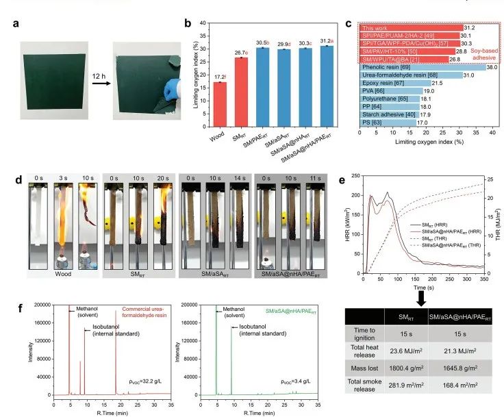 图5:SM/aSA@nHA/PAE胶粘合剂的安全性。a)演示SM/aSA@nHA/PAERT胶粘剂与亚麻纤维壁纸的粘附强度。b)限制木材、SMRT、SM/PAERT、SM/aSA RT、SM/aSA@nHART和SM/aSA@nHA/PAERT粘合剂的氧指标。c)不同高分子材料与SM/aSA@nHA/PAERT粘合剂的极限氧指标的比较。d)木材、SMRT、SM/aSART和SM/aSA@nHA/PAERT粘合剂的燃烧演示(持续点火10 s)。e)SMRT和SM/aSA@nHA/PAERT胶粘剂的HRR和THR曲线。f)从商用室温固化脲醛树脂和SM/aSA@nHA/PAERT胶粘合剂中释放挥发性有机物。