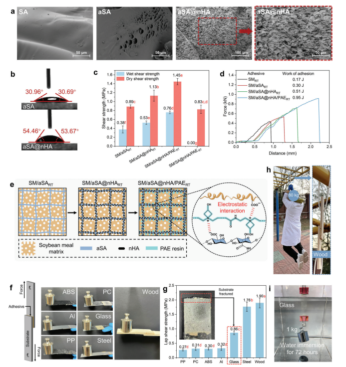 图3:SM/aSA@nHA/PAERT粘合剂的设计和粘附性能。a)干燥的SA、aSA和aSA@nHA固体的显微形貌。b)aSA和aSA的WCA@nHA胶片。c)SM/aSART、SM/aSA@nHART、SM/aSA@nHA/PAERT和SM/SA@nHA/PAERT粘合剂的湿剪和干剪强度。d)SMRT、SM/aSART、SM/aSA@nHART和SM/aSA@nHA/PAERT粘合剂的干抗剪强度的力-距离曲线。e)SM/aSA@nHA/PAERT胶粘合剂的结构。f)由SM/aSA@nHA/PAERT胶粘合剂(200 g重量)连接的不同基板制备的搭接试样的载荷演示。g)由SM/aSA@nHA/PAERT粘合剂粘合的不同衬底制备的搭接试样的剪切强度。h)SM/aSA@nHA/PAERT胶粘剂可容纳一个80公斤的成年人的木基材的粘接强度演示。i)SM/aSA@nHA/PAERT的粘合剂的72小时湿粘接强度演示。