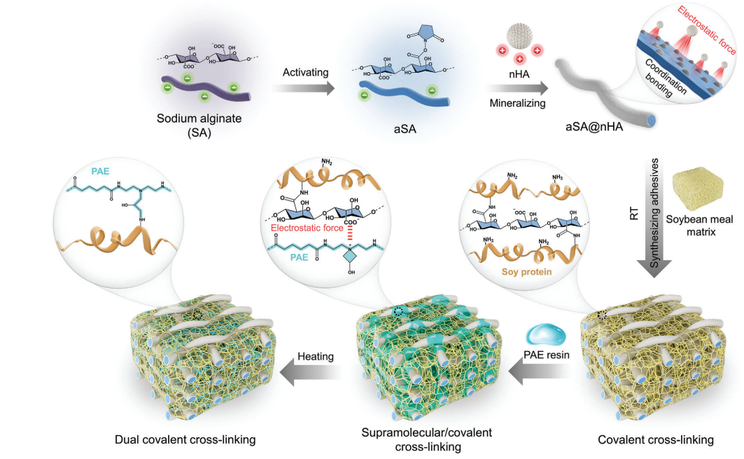 以植物蛋白为基础的粘合剂因其低成本和环保性而日益受到重视。然而,在室温固化条件下实现阻燃性和长期耐水性仍然是一项挑战。在此,一种由大豆粉(SM)、海藻酸钠(aSA)、纳米羟基磷灰石(nHA)和聚酰胺胺-环氧氯丙烷合成的新型粘合剂。