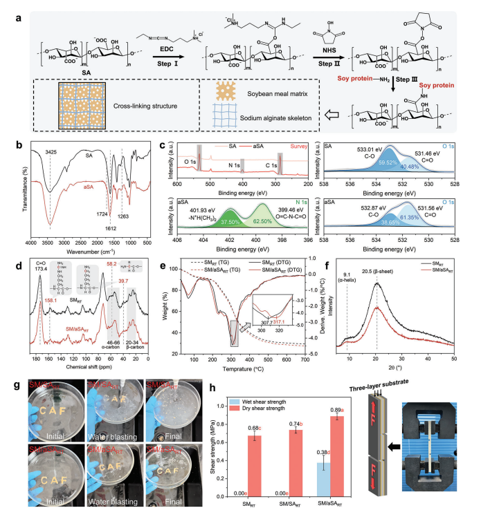 图2:胶粘剂的室温共价交联行为的表征。a)SM与SA之间的室温交联反应机理。b)SA和aSA溶液冻干样品的FTIR光谱。c)SA和aSA溶液冻干样品的XPS光谱。d)固化SMRT和固化SM/aSART胶粘剂的固态13C NMR谱。e)SMRT和SM/aSART胶粘合剂的热重分析(10°C min−1热速率)。f)SMRT和SM/aSART胶粘剂的XRD光谱。g)SMRT和SM/aSART胶粘剂的水爆破演示(恒水流速)。h)SMRT、SM/SART和SM/aSART粘合剂的湿剪强度和干剪强度。