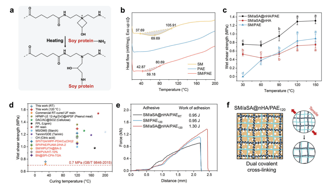 图4:SM/aSA@nHA/PAERT粘合剂的适用温度。a)PAE树脂与大豆蛋白的反应机理。b)SM、PAE树脂和SM/PAE粘合剂的DSC曲线。c)SM/PAE、SM/aSA@nHA和SM/aSA/aSA@nHA/PAE粘合剂在RT-150°C固化温度范围内的湿剪切强度。d)SM/aSA@nHA/PAE粘合剂与现有粘合剂(红色表示大豆基粘合剂)的湿剪强度比较。e)SM/aSA@nHA/PAERT、SM/ PAE120和SM/aSA@nHA/PAE120粘合剂的干抗剪强度的力-距离曲线。f)SM/aSA@nHA/PAE120粘合剂的拓扑结构。