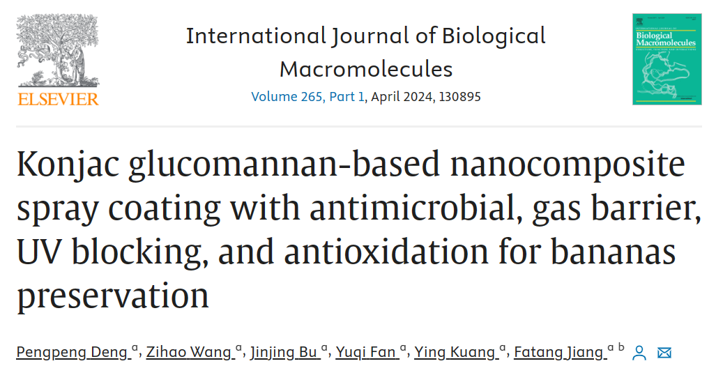 近日,湖北工业大学工业微生物湖北省重点实验室姜发堂教授团队在《International Journal of Biological Macromolecules》上发表题为“Konjac glucomannan-based nanocomposite spray coating with antimicrobial, gas barrier, UV blocking, and antioxidation for bananas preservation”的研究型论文。