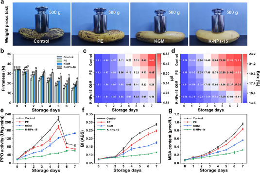 硬度变化同样是反映水果在储存过程中质量的重要指标(图 6a 和 b)。将500 g砝码放在储存7天的香蕉上进行压力测试,结果如图6a所示。与对照组、PE组和KGM组相比,K-NPs-15组香蕉变形最小,直观地证明K-NPs-15组香蕉硬度最高。我们进一步系统地研究了香蕉在储存过程中的硬度变化(图6b)。硬度值随着贮藏时间的增加而逐渐降低,这主要是因为香蕉成熟过程中释放的乙烯促进了果胶酶的分泌,催化了果胶的分解,导致香蕉硬度降低。在贮藏期间,对照组、PE、KGM组和K-NPs组香蕉的硬度依次增加。值得注意的是,K-NPs-15组香蕉贮藏7 d后硬度仍然较高(22.65 ± 1.96 N),进一步证明K-NPs-15涂层可以延缓香蕉的成熟。这主要是由于K-NPs-15涂层的透氧率较低,可以显著抑制呼吸代谢,延缓香蕉硬度的降低。