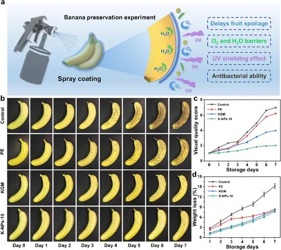 通过水果喷雾保鲜实验研究了K-NPs复合膜的果实保鲜效果(图5a)。选取力学性能最好、氧和水蒸气透过率最低的K-NPs-15薄膜作为研究对象,研究复合薄膜的保鲜性能。从视觉外观和视觉质量得分(图5b和c)来看,所有香蕉在贮藏之初都是黄绿色的。随着贮藏时间的延长,对照组香蕉贮藏3d后出现褐变和随机斑点,PE组和KGM组香蕉贮藏4d后出现褐变。令人惊讶的是,K-NPs-15组的香蕉成熟速度明显较慢,直到第7天才变成褐色,这表明K-NPs-15薄膜可以延长香蕉的保质期。图5d显示了香蕉在贮藏过程中的失重曲线。随着贮藏时间的延长,各组香蕉的失重率逐渐增加。7 d后,对照组香蕉失重率高达14.42±0.69%,而K-NPs-15组仅为7.59±0.56%,证明K-NPs涂层可以延缓香蕉失水。这主要是由于K-NPs-15涂层的透氧性和水蒸气渗透性较低,可以有效减少香蕉在贮藏过程中的呼吸和水分蒸发。