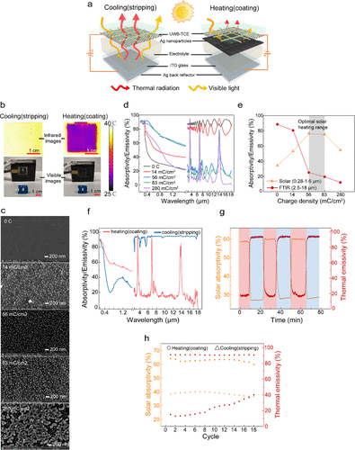 太阳能和中红外辐射协同热管理的实验演示。(a)电致变色器件工作原理示意图。发射率由UWB-TCE下的层决定,太阳反射率由剥离状态下的银背反射器和涂覆状态下的银纳米粒子决定。(b)冷却和加热状态下设备的可见光(下一行)和红外(上一行)图像。冷却模式表现为一个高发射率的太阳能反射器,加热模式表现为一个低发射率的太阳能吸收器。(c) SEM图像和(d)太阳和中红外吸收/发射率光谱。(e)不同电荷密度下UWB-TCE薄膜上沉积金属的加权平均吸收率/发射率。(f)冷却和加热状态下装置的太阳吸收光谱和红外发射光谱。以0.5 nm厚度Pt (g)和0.75 nm厚度Pt (h)的循环控制装置,在加热和冷却状态下的太阳吸收率(λ = 550 nm)和红外发射率(λ = 10 μm)。在加热状态下,b、f、g和h面板的电沉积电荷密度为75 mC/cm2。