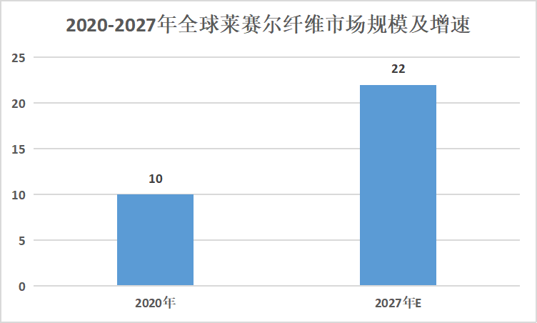 莱赛尔纤维已成为行业投资的热点,产能由2015年的3.6万吨增长到2019年的13.85万吨,年均增长40.05%;产量由2015年的0.9万吨增长到2019年的4.3万吨,年均增长101.03%。目前在建产能43万吨,未来规划产能300余万吨。据统计,2020年Loycell纤维销售额在2020年突破10亿美元,2027年全球市场将突破22亿美元,2020-2027年CAGR约12%。