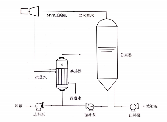 开车时,首先用生蒸汽给换热器加热(蒸汽走管外),使管内的溶液加热沸腾,产生二次蒸汽,二次蒸汽经MVR压缩机压缩,压力、温度升高,热焓增加,然后送到换热器当做加热蒸汽使用,使料液维持沸腾状态,加热蒸汽本身则冷凝成水。这一过程往复循环连续进行,当产生的二次蒸汽经压缩后足以加热料液蒸发时,就不再需要生蒸汽。