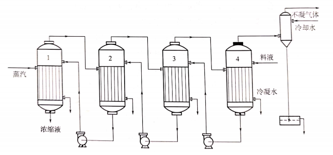 逆流流程中,溶液与二次蒸汽的走向相反,即蒸汽从一效到四效,而溶液是从四效到一效。由于一效中的溶液温度和黏度最高,四效中的料液温度和黏度最低,因此,它不具有自发流动的动力,需采用强制的方法。仍以四效为例,物料从四效进入,通过泵被强制顺序送入三效、二效和一效,浓缩液在一效排出。蒸汽的路径与并流工艺相同,外来的蒸汽从一效进入,一效产生的二次蒸汽作为二效的加热蒸汽,二效产生的二次蒸汽用于三效的加热,依此类推,四效排出的蒸汽通过冷却器冷却成水,不凝气体通过适当的措施排放。
