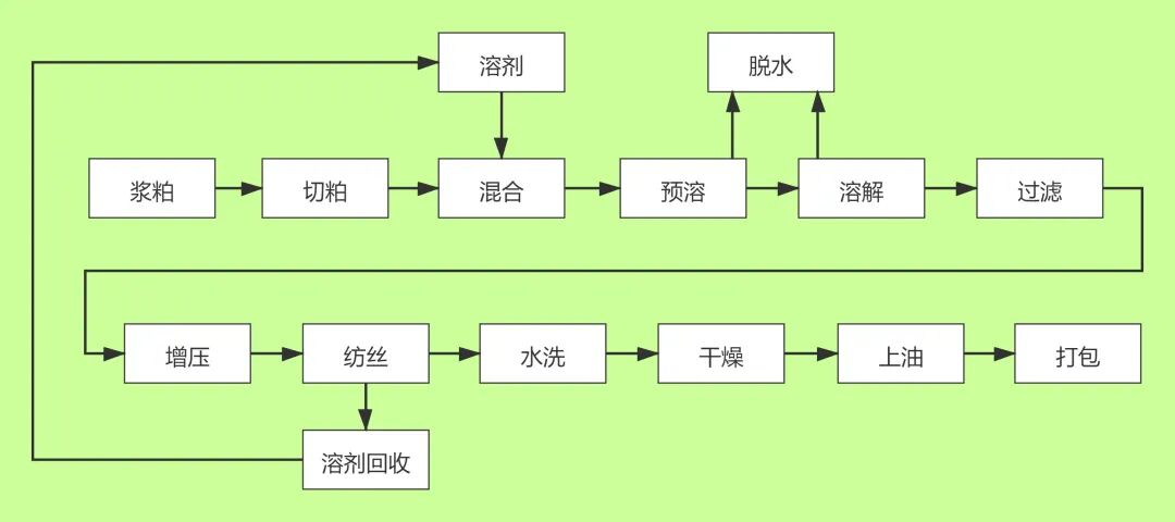 目前工业化生产中,溶液制备过程是通过NMMO水溶液与浆粕物理混合,再提高NMMO水溶液的浓度,最终制成纤维素/NMMO / H2O的纺丝溶液;纺丝基本都采用干喷湿纺的技术路线;纤维成形后的水洗、精练、干燥、上油和打包工艺几乎与粘胶的一样。