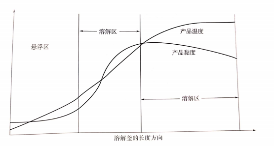 图5-12 溶解釜长度方向上的温度和黏度变化曲线
