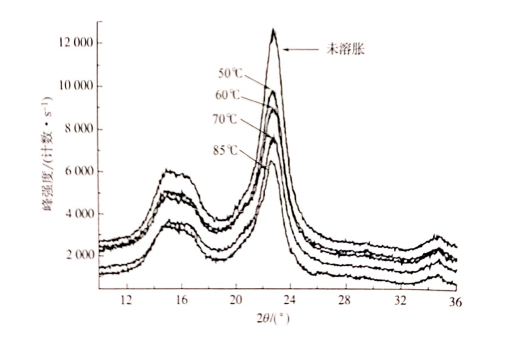 李春花等对纤维素溶胀过程进行了研究,他们将在各种不同条件下充分溶胀的浆粕,用水清洗,除去NMMO,再经抽滤和真空干燥后,剪成粉末,用X射线衍射仪测定其衍射峰强度。对不同溶胀温度和不同NMMO溶液浓度处理后浆粕的结晶度进行了研究。