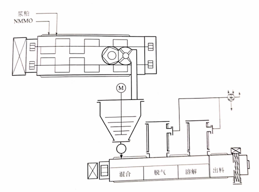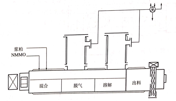 浆粕由超细粉碎机粉碎成超细粉末,再经称量投入混合设备内,与此同时,将高浓度的NMMO/H2O溶液按比例注入混合设备内,混合物导入特殊设计的溶解装置内(双螺杆),直接完成混合物的溶解;
