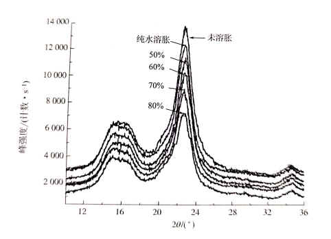 通过测定浆粕厚度和单根纤维直径的变化可以直观地了解浆粕在NMMO水溶液中的溶胀规律。面对经过各种不同溶胀条件处理的纤维进行X射线衍射扫描,可以为我们提供更多的信息,衍射强度的变化可以间接验证溶剂在纤维素内部深入的程度。