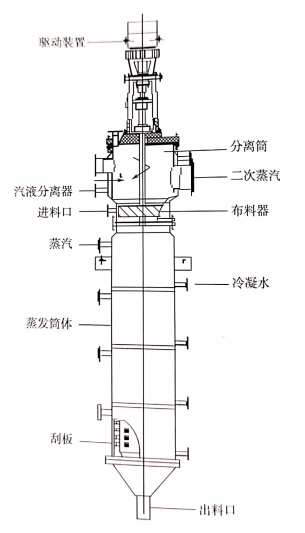 薄膜蒸发器通常由驱动电动机、变速器、钻子、刮板、进料口、布料器、分离筒、汽液分离器、蒸发筒体、出料口等组成。刮板通常由多组形状特殊的金属件构成,并按照一定的排列方法固定在转子上。物料由进料口导入,在分料器中均化后,送入薄膜蒸发器的上部,刮板将物料在筒体上铺成膜,筒体的高温使物料中的水分迅速蒸发,并由刮板不断向下推进,水分被蒸发后,形成的蒸汽流上升,经气液分离器进行气液分离,分离室有较大的空间,使气流速度迅速降低,部分被二次蒸汽夹带的纤维素细粒被分离并返回蒸发器的布料口,分离后的蒸汽流流向蒸发器的顶部进入外置冷凝器。薄膜蒸发器的工作原理如图5-9所示。