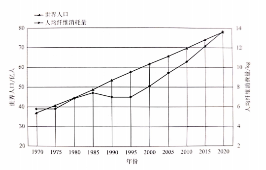 市场需求是我们确定纤维总需求量的金标准,全世界人口增长和人民生活水平提高带来的消费增长是影响纤维需求的主要因素,近50年世界人均纤维消耗量和人口增长数如图8-1所示。