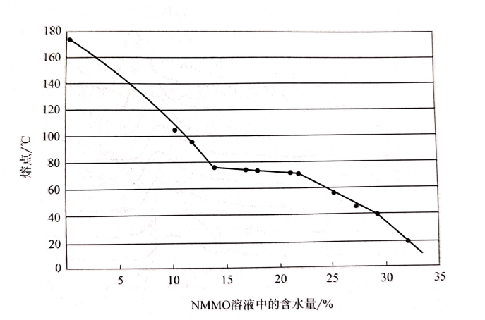 由图可见,NMMO水溶液的熔点随溶液中水含量的增加而减少,溶液中的含水量在13%时存在一个拐点,当溶液中含水量进一步减少时,溶液的熔点会快速增加。而水的含量超过30%后,在常温下便以液体形式存在。市售的NMMO通常都是含有50%NMMO的水溶液。