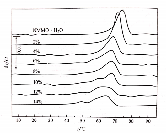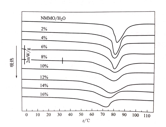 刘瑞刚等对含有不同比例纤维素的纤维素/NMMO·H2O溶液的熔融和固化过程进行了研究。实验中采用了含水为13.3%的NMMO溶液,纤维素的含量从2%~12%,用膨胀计测定比容,用DSC测定比热,通过溶液在升温过程中出现的比热和比容的突变来确定其熔点。