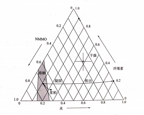 图中带有箭头的曲线描述了Lyocell纤维在制备过程中三种组分的变化过程,也清晰地描述了纤维素不溶解—溶解—不溶解的过程。