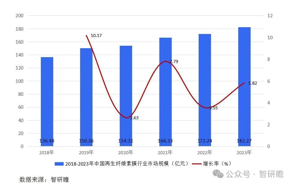 据智研瞻统计显示,2018年中国再生纤维素膜行业市场规模136.48亿元,2023年中国再生纤维素膜行业市场规模182.27亿元,同比增长5.82%。2018-2023年中国再生纤维素膜行业市场规模如下: