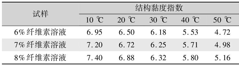 在高剪切速率条件下,不同固含量纤维素溶液的结构黏度指数如表1所示。由表1可得,6%~8%固含量的纤维素溶液在10~50 ℃中结构黏度指数是4.72~7.40。在其他条件不变情况下,纤维素溶液的结构黏度指数随温度的升高或者固含量的降低而下降。温度升高或者固含量的降低,使得溶液的黏度降低,溶液内分子链缠结密度降低,结构化程度降低,因此结构黏度指数也下降。较低的结构黏度指数可在后续加工中承受较大牵伸力,溶液加工性能好。孙永连[19]将DP580纤维素溶解在NMMO体系中,制得6%~10%的纤维素溶液,在75 ℃下结构黏度指数是7.51~13.55。段先泉[20]将DP900纤维素溶解在1-乙基-3-甲基-咪唑醋酸盐[EMIM]Ac体系中,制得8%的纤维素溶液,在80 ℃下结构黏度指数是8.6。钟璇等[21]将DP350的纤维素溶解在碱脲体系中,制备6%纤维溶液在30 ℃下结构黏度指数是7.6,可以看出纤维素/TEAOH/H2O体系在加工过程中结构化程度更低,较低的结构黏度指数有利于后续溶液的加工。