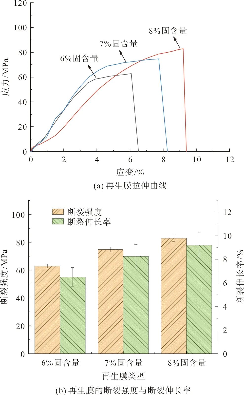 3) 再生纤维素膜表面与截面结构致密,无分层现象与明显孔洞,再生纤维素膜力学性能良好。力学性能随着固含量的增加(6%~8%),断裂强度由62.8 MPa±1.4 MPa增加到82.3 MPa±2.3 MPa,断裂伸长率由6.5%±1.2%增加到9.2%±1.5%。