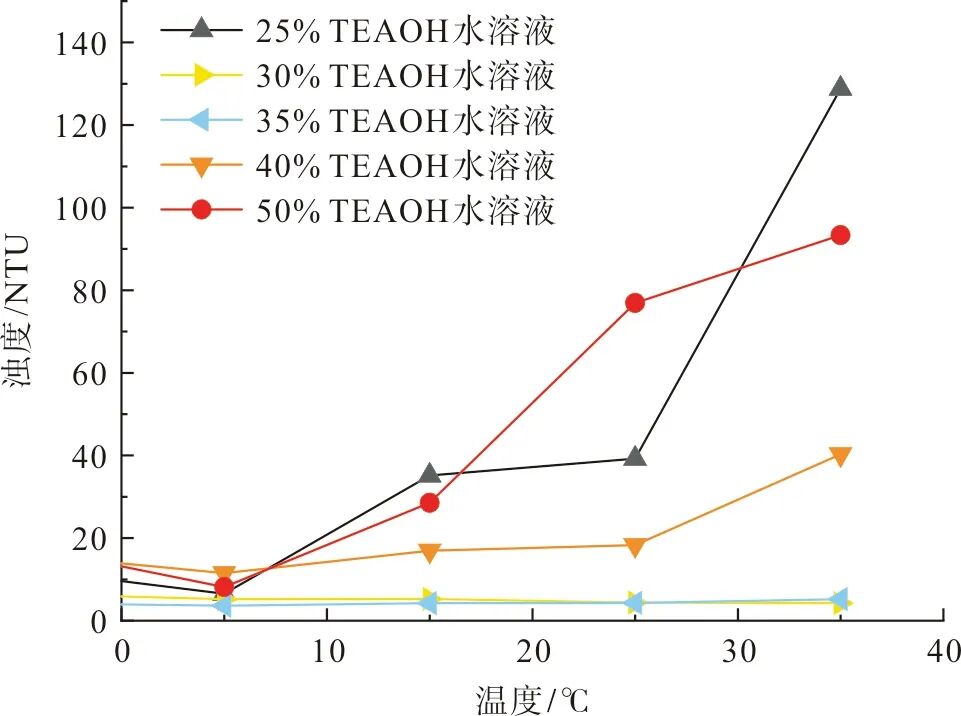 图2显示了纤维素/TEAOH/H2O溶液浊度与溶解温度、溶剂质量分数的关系。整体而言,低温下不同质量分数TEAOH/H2O中纤维素溶液均实现良好溶解,随着溶解温度的提高,纤维素/TEAOH/H2O溶液浊度增加,溶解效果变差。降低温度后溶剂更易溶解纤维素,推测这是因为低温下TEAOH水合物结构趋近于稳定,溶剂逐步破坏纤维素分子内和分子间氢键,最终导致纤维素的溶解;而提高温度后溶剂溶解效果反而变差,是升温后由于构象效应促使聚合物链极性减小,通常以“浑浊”效应显现,抑制了溶解。Lindman等[15]发现极性更强的构象有助于促进纤维素与溶剂的相互作用。当溶剂在30%~35%内,温度的改变并未影响溶剂溶解纤维素的能力,可能是溶剂在30%~35%内,溶剂结构更为稳定,温度的改变对溶剂结构的破坏不明显。