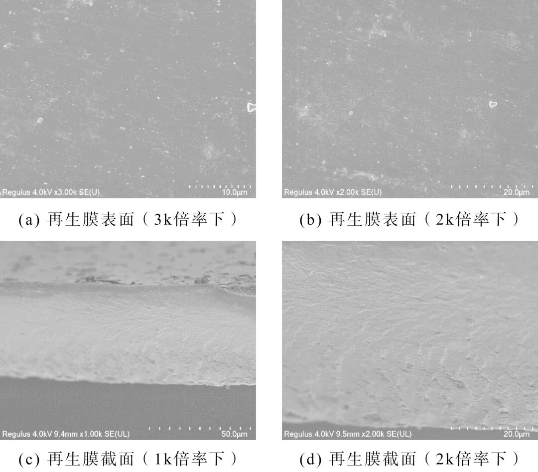 利用SU8100场发射扫描电子显微镜对再生膜表面、断面形貌进行表征,断面观察采用液氮对薄膜进行脆断,表面与断面喷金后观察。