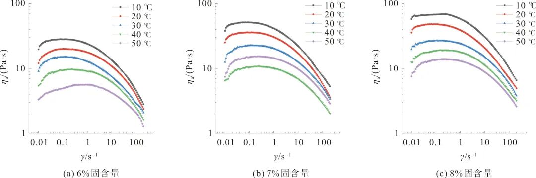 图5 不同温度下不同固含量纤维素溶液的稳态流变曲线