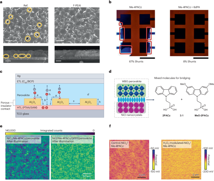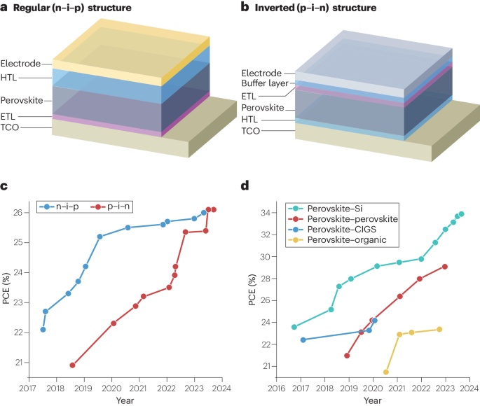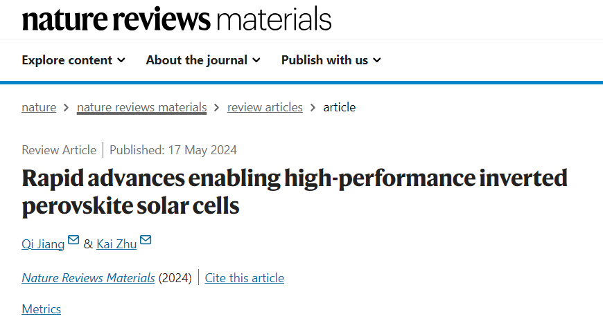 随着对可再生能源需求的不断增长,寻找高效、稳定的太阳能电池技术成为了科学家们的重要课题。其中,有机-无机混合金属卤化物钙钛矿材料被发现具有出色的光电转换性能,成为了太阳能电池领域的一个引人注目的新兴材料。这种材料构成的钙钛矿太阳能电池(PSCs)在短短的十年时间内取得了巨大的进步,其功率转换效率(PCE)迅速增长,为实现可持续能源转型提供了希望。钙钛矿太阳能电池(PSCs)是一种基于有机-无机混合金属卤化物钙钛矿材料的光电转换器件,具有高效的光电转换性能。然而,尽管PSCs表现出很高的潜力,但在实际应用中仍然存在一些挑战。其中之一是PSCs的结构设计,主要有两种结构:常规结构和倒置结构。这两种结构的选择对器件的性能和稳定性至关重要,因此成为了研究的重点之一。钙钛矿太阳能电池中的一个重要问题是在器件运行过程中出现的效率损失和稳定性问题。这些问题主要源于钙钛矿材料本身以及其与电荷传输层(CTLs)之间的界面相互作用。此外,常用的有机空穴传输层(HTL)在掺杂和氧化方面存在一些挑战,限制了器件的效率和稳定性。有鉴于此,美国(National Renewable Energy Laboratory)国家可再生能源实验室朱凯和蒋琦两个人在“Nature Reviews Materials”期刊上发表了题为“Rapid advances enabling high-performance inverted perovskite solar cells”的最新论文综述。科学家们进行了大量的研究工作。他们通过改进传输材料的选择和性能,优化钙钛矿材料的组成和制备方法,以及设计界面工程策略来提高PSCs的性能和稳定性。特别地,他们对倒置结构的p-i-n PSCs进行了深入研究,通过避免有害的掺杂和优化界面工程,显著提高了器件的稳定性和效率。【科学亮点】