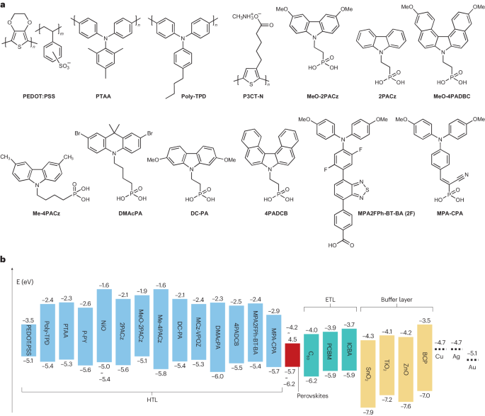 图2:高效p–i–n钙钛矿太阳能电池的代表性电荷传输材料。