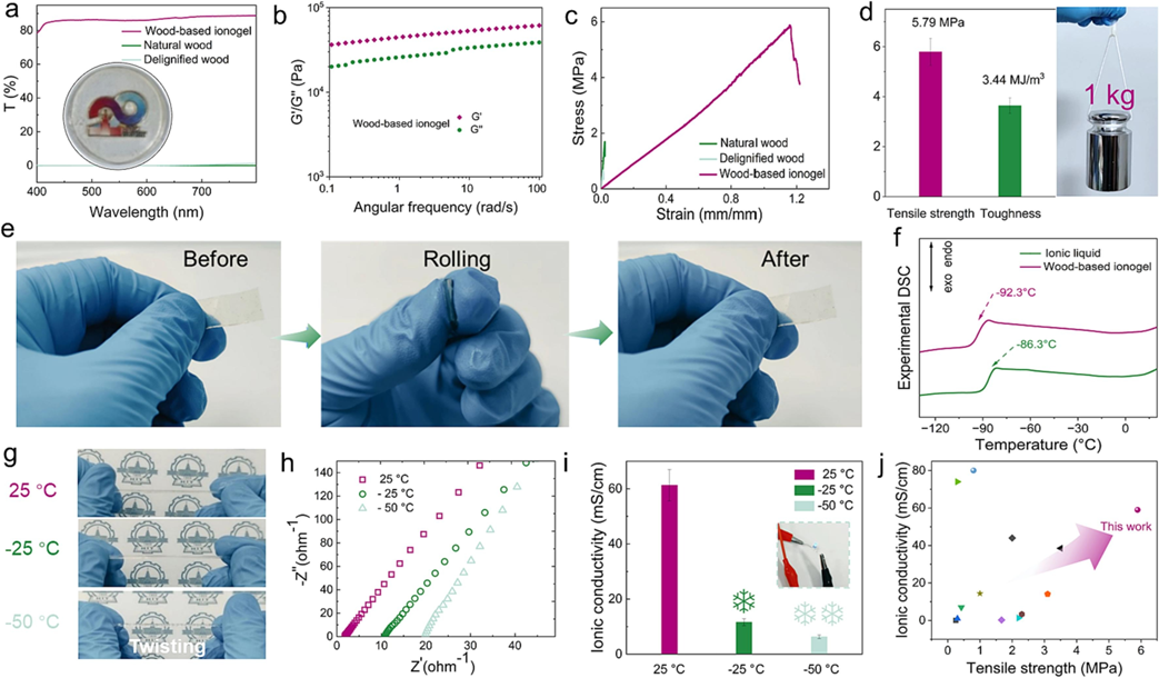 图2. 全纤维素离子凝胶的抗拉强度、离子电导率和抗冻性能测试结果