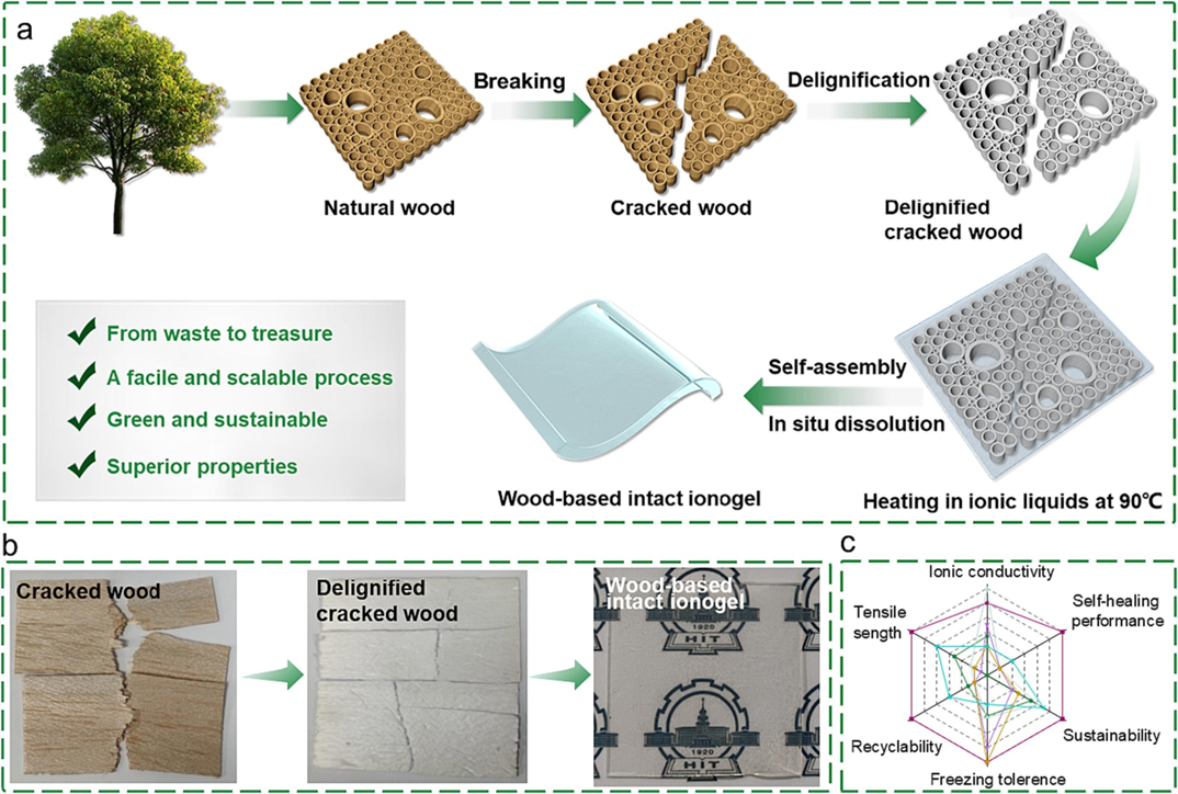 天然高分子材料,主要是从木材中提取的可再生纤维素,通过将纤维素与碳材料、导电聚合物、无机盐、离子液体(ILs)等各种导电介质结合,开发出多种纤维素基导电凝胶。其中,由ILs组成的导电纤维素基离子凝胶具有良好的防冻性能和高导电性。然而,目前还没有研究直接将木材,特别是低价值木材(包括破碎的木材、木片、木屑和其他木材残留物)转化为高性能的全纤维素离子凝胶。这一技术将有利于木材资源的高附加值利用,朝着可持续发展的方向发展。