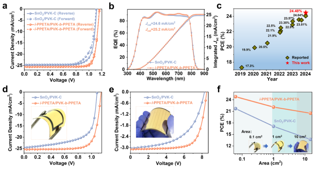 图5:a)0.062-cm2柔性pero-SCs在AM 1.5G,100 mW/cm2下的J-V曲线。b)柔性器件的EQE曲线。c)近几年报道的高性能柔性pero-SCs的认证PCE统计图。d)1.004-cm2柔性pero-SCs的J-V曲线。e)15.64-cm2柔性钙钛矿太阳能组件的J-V曲线。f)柔性pero-SCs的PCE与面积的关系。