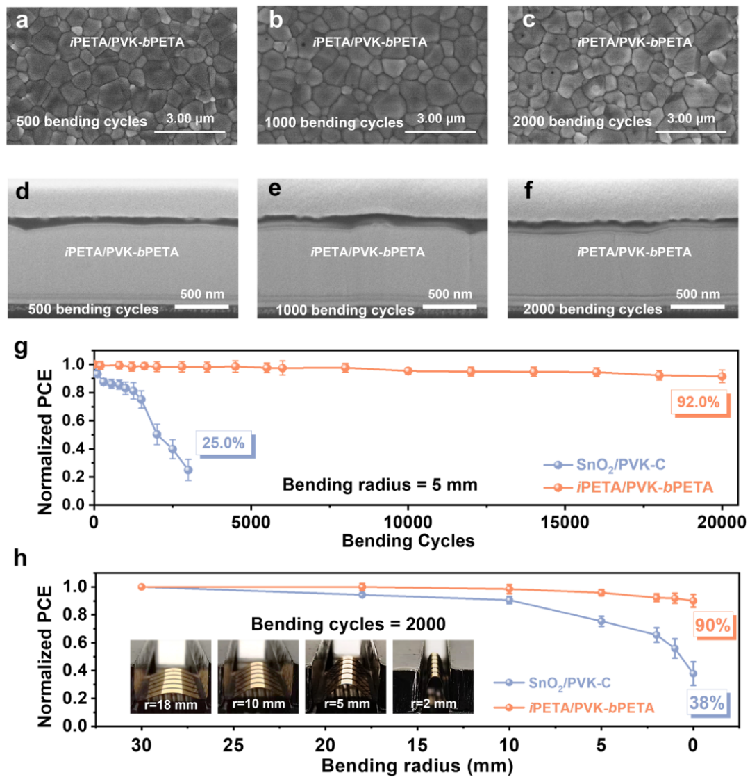 图4:i-PPETA/PVK-b-PPETA薄膜在半径为5 mm的弯曲循环后的表面和截面SEM图像,a, d)500次弯曲循环;b, e)1000次弯曲循环;c, f)2000次弯曲循环。g)半径为5 mm的弯曲循环下柔性pero-SCs的PCE衰减曲线。h)2000次弯曲循环后柔性pero-SCs的PCE与弯曲半径的关系。插图:弯曲测试的照片。