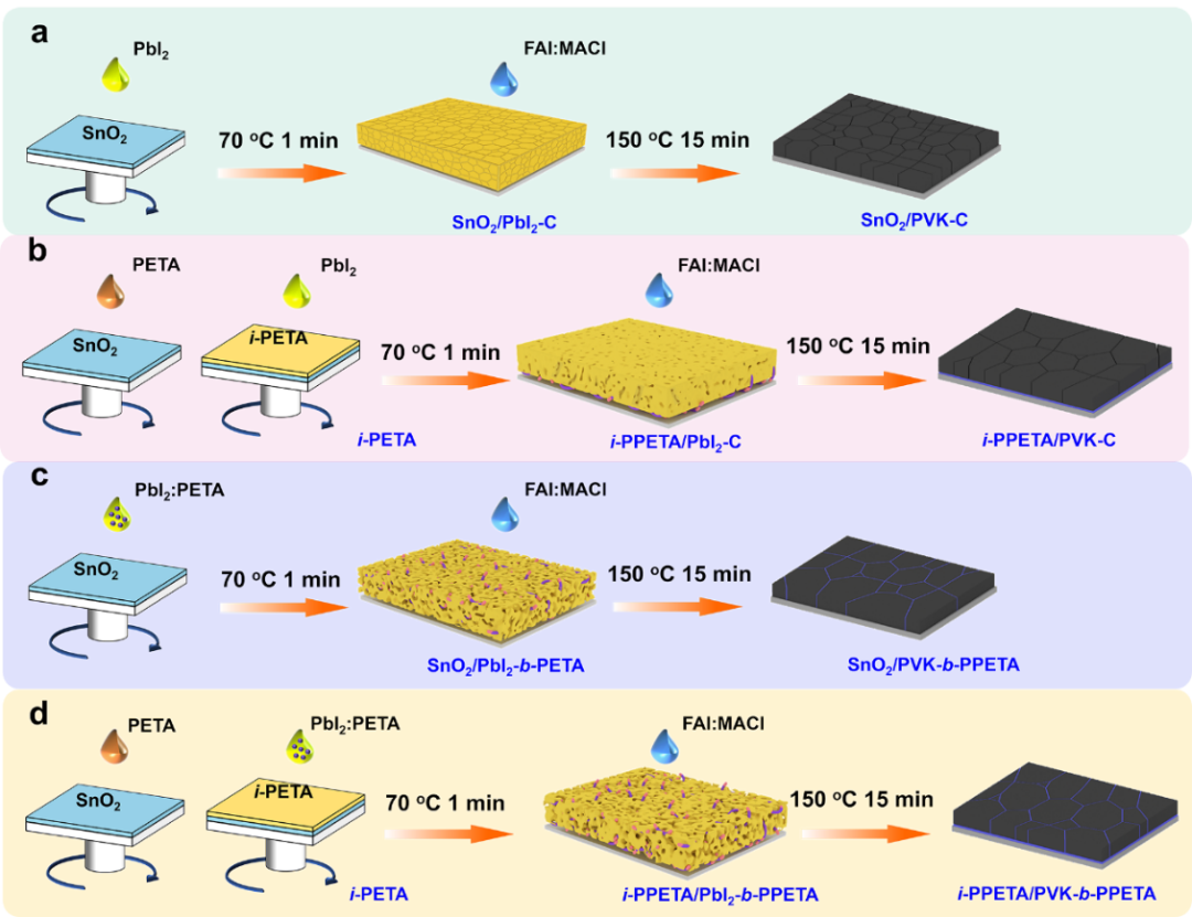 图2:FAPbI3钙钛矿薄膜的制备流程。a)SnO2/PVK-C;b)i-PPETA/PVK-C;c)SnO2/PVK-b-PPETA;d)i-PPETA/PVK-b-PPETA。