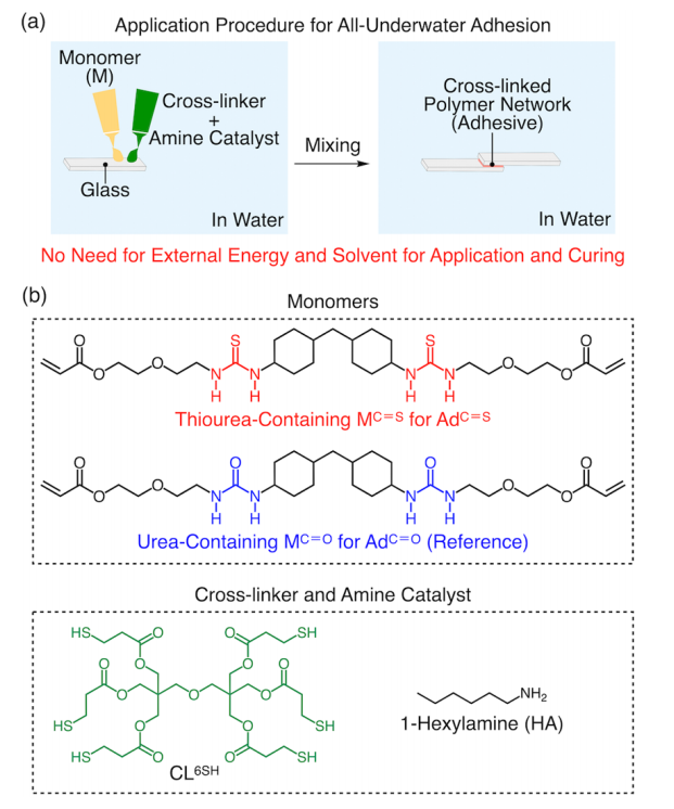 图2:(a)全水下粘接应用程序示意图。(b)含硫脲单体(MC=S)、含脲单体(MC=O)、多价硫醇交联剂(CL6SH)和胺催化剂(HA)的分子结构。