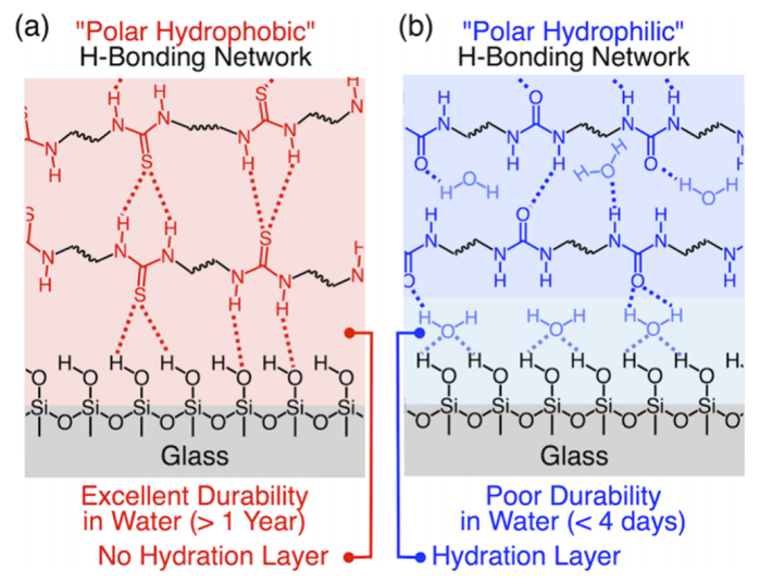 据我们所知,在我们的自修复聚合物之前,硫脲从未在材料科学中得到应用在此,基于我们的发现,自修复聚醚硫脲粘附在湿玻璃表面,我们发现硫脲作为“极性疏水”氢键基序。这使我们能够开发出一种非常耐用的全水下粘合剂,即使在海水中也能保持1年以上的高粘合强度。这种硫脲基粘合剂可以很容易地在水中粘附各种材料,包括玻璃、金属、具有极性功能的塑料和木材,而不需要任何外部能量和溶剂就可以应用于目标表面。因此,具有“极性疏水”硫脲单元的AdC=S引起了材料科学的突破。